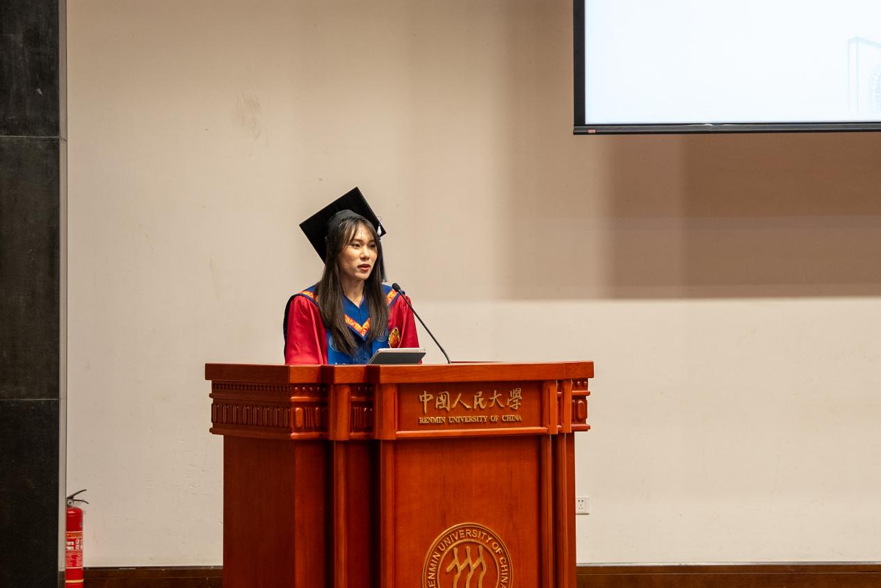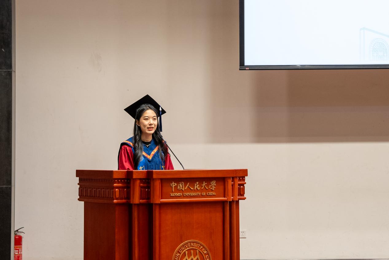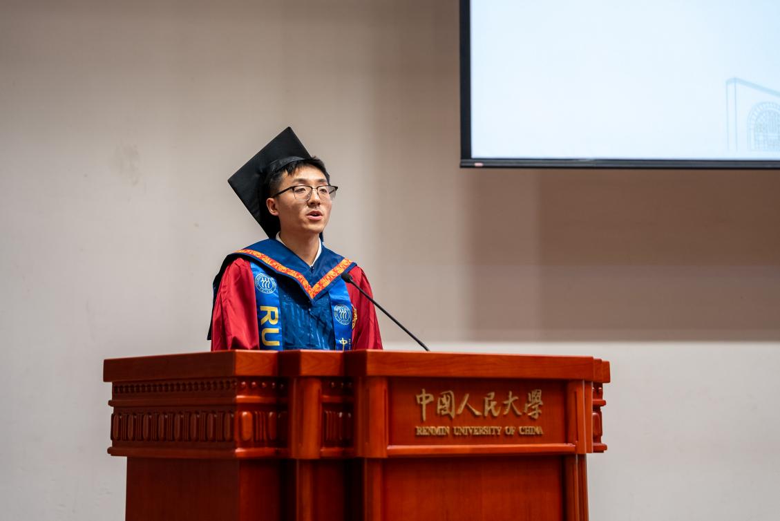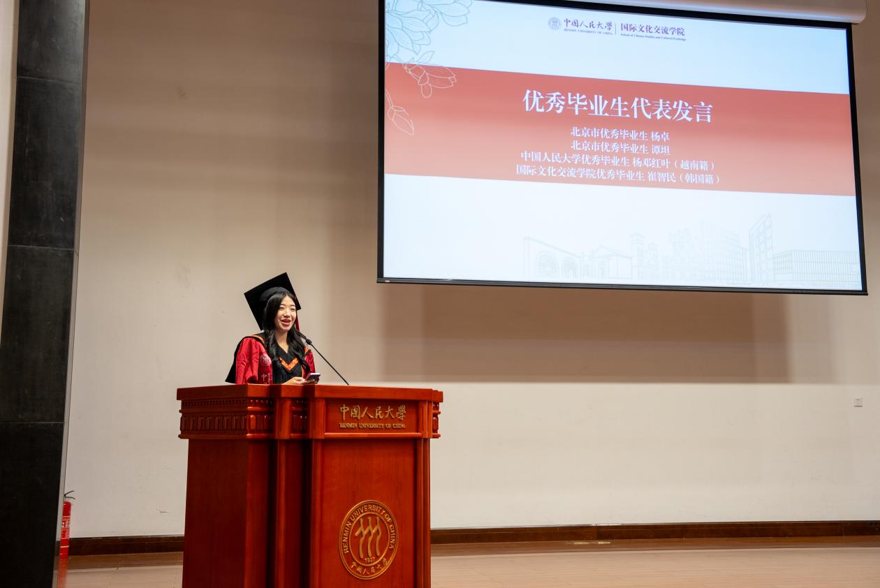北京市级优秀毕业生2022级汉语国际教育硕士1班员工代表杨卓用最朴实的语言,讲述了从苏州校区开学至今的成长印记。春日教室的第一次见面,夏夜荷塘边的葫芦丝悠扬,红旗下庄严宣誓的那一刻,以及小组讨论时迸发的思想火花,每一个瞬间都见证了他的蜕变。在这里,他不仅夯实了专业功底,更从“强国先锋、复兴栋梁”的使命召唤中,汲取了无限动力。此刻,他心怀感恩,将最深的敬意献给悉心教导的老师和孕育梦想的母校;未来,他将继续以“人大人”的身份,把中国文化的魅力带向世界。